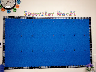 I just finished my bulletin board for student work. The black spots on the fabric are mini paper clips already hanging on a thumb tack.( you can't tell but I actually found pink, purple and turquoise tacks and paper clips at Office Max!) I thought this was genius so you can just hang other papers over each other and have a mini portfolio until you are ready to hand back or file.